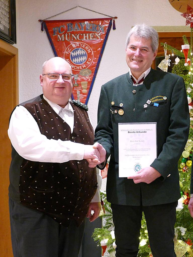 Dieser ließ es sich nicht nehmen, persönlich in das Sport- und Schützenheim Mühlhausen zu kommen, um „in der zweiten Heimat von Dirk Neitzert“ ihn für seine 30-jährige Tätigkeit als Schützenmeister die „Ehrennadel in Silber“ vom Schützenbezirk Niederbayern zu überreichen.