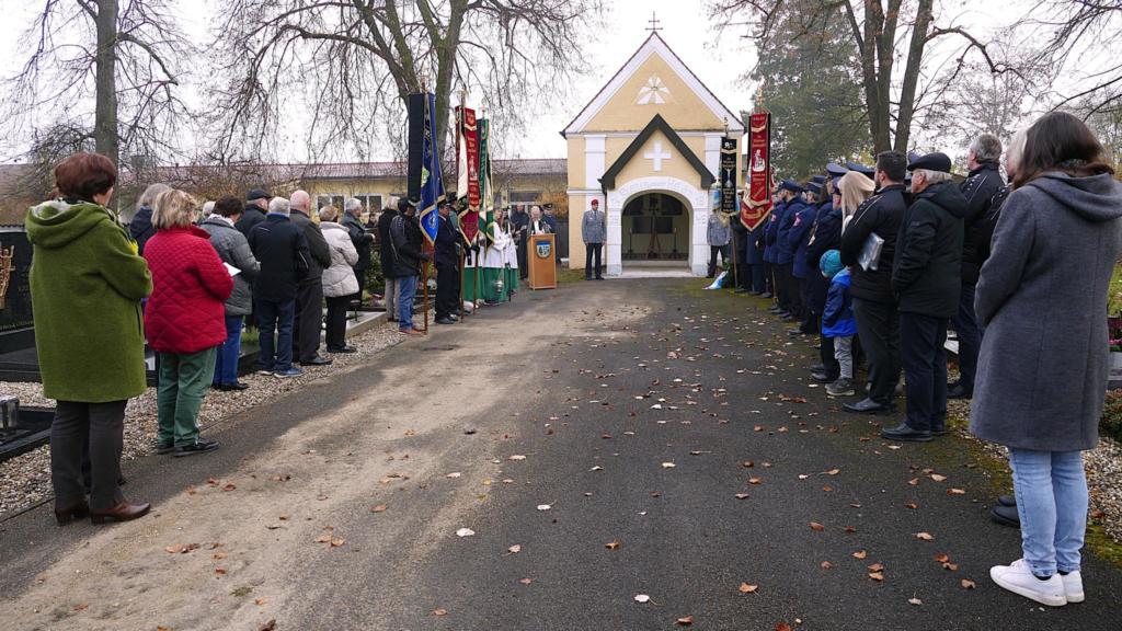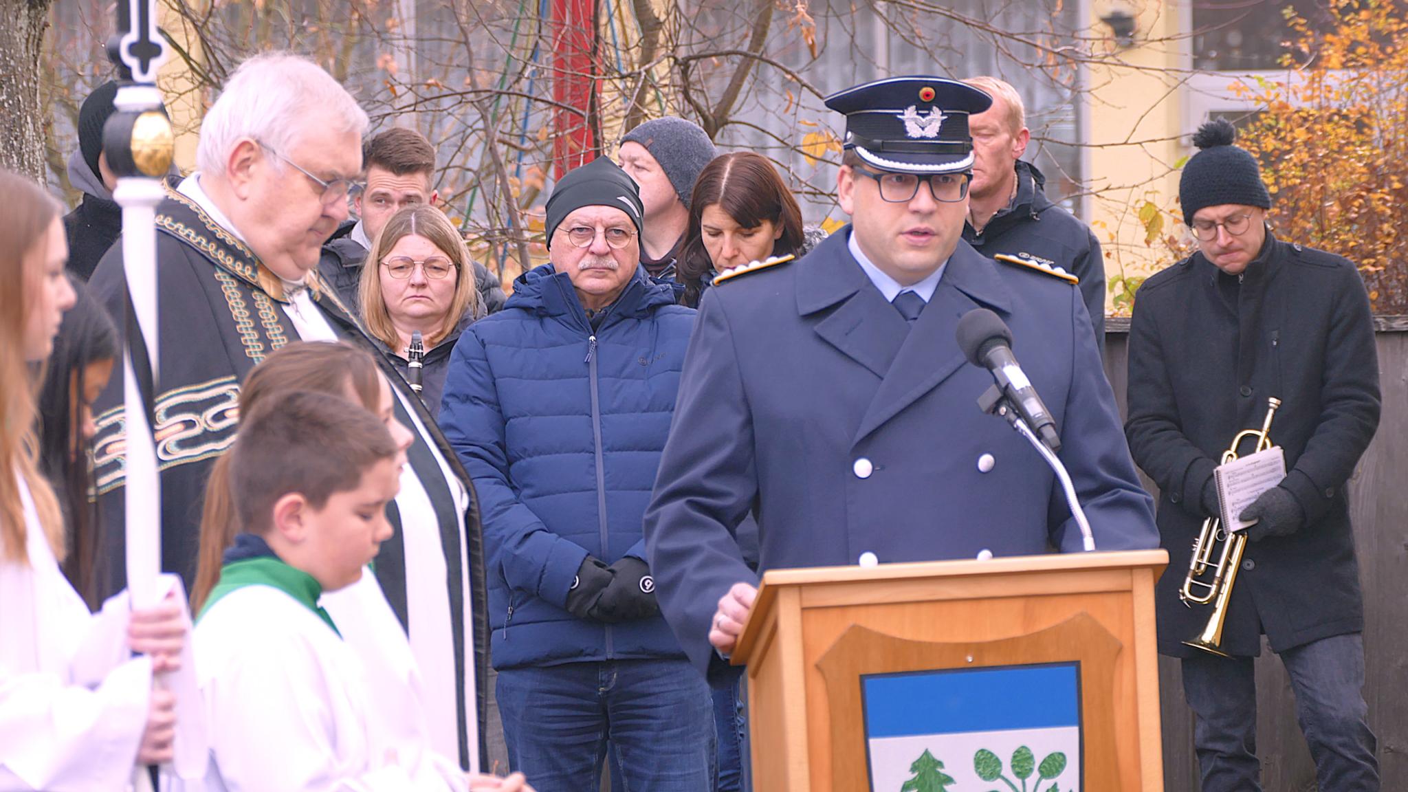Im Rahmen einer feierlichen Andacht von Pfarrvikar Norbert Musiol rief Hauptmann der Reserve Sebastian Hainz zum Gedenken an die getöteten Soldaten, Vertriebenen und Zivilisten auf.