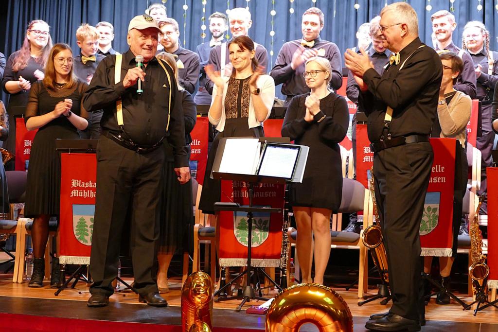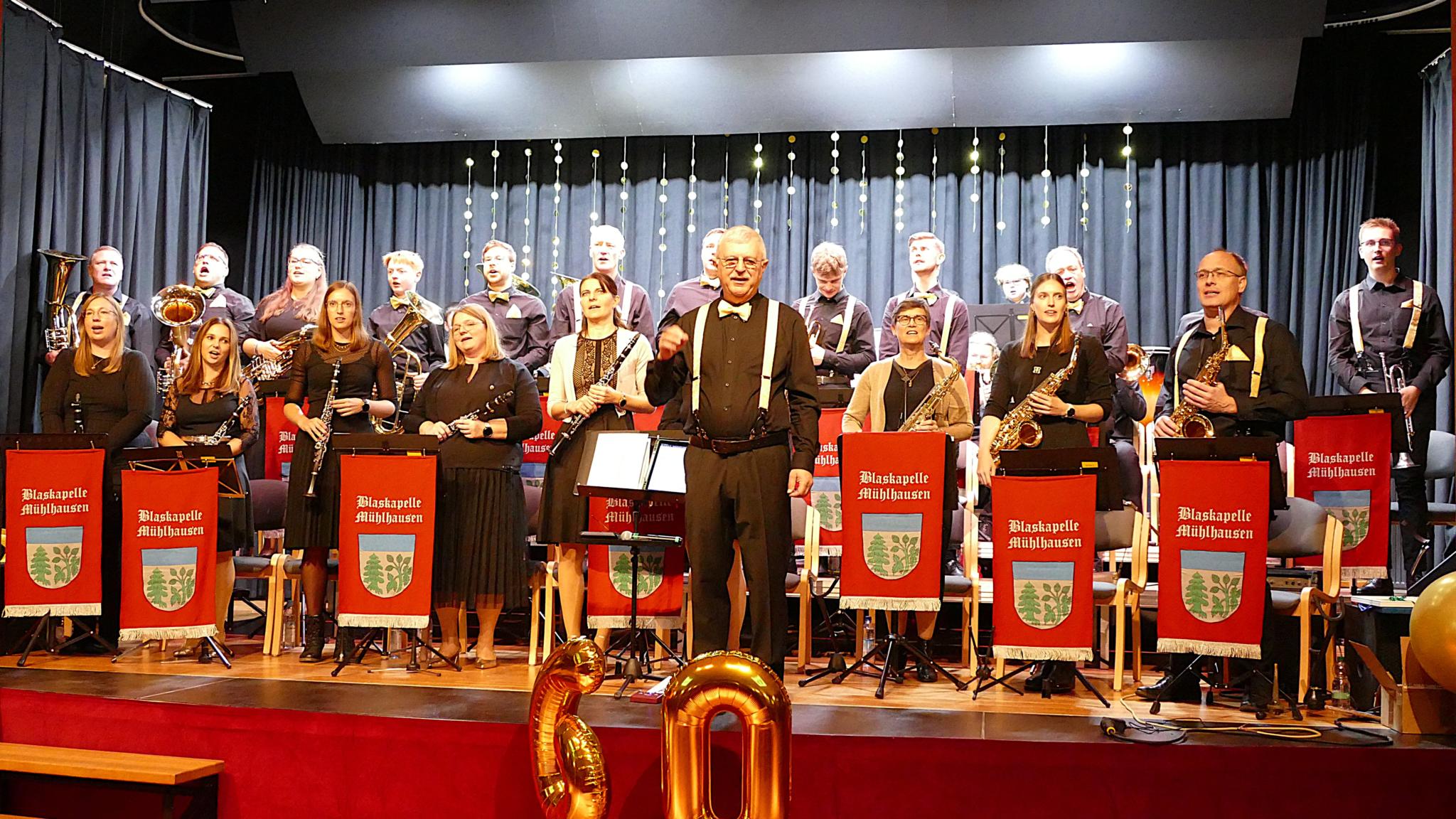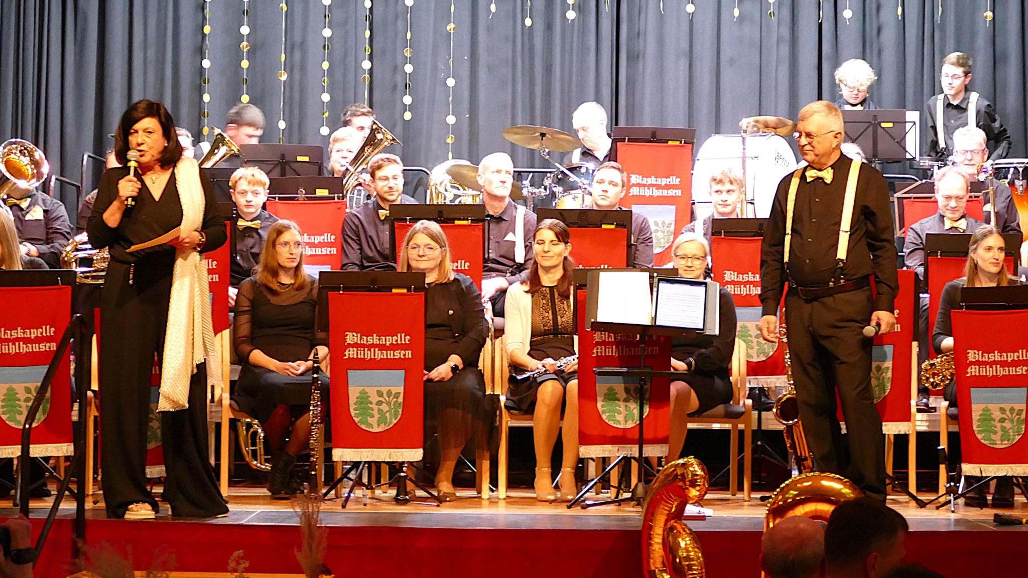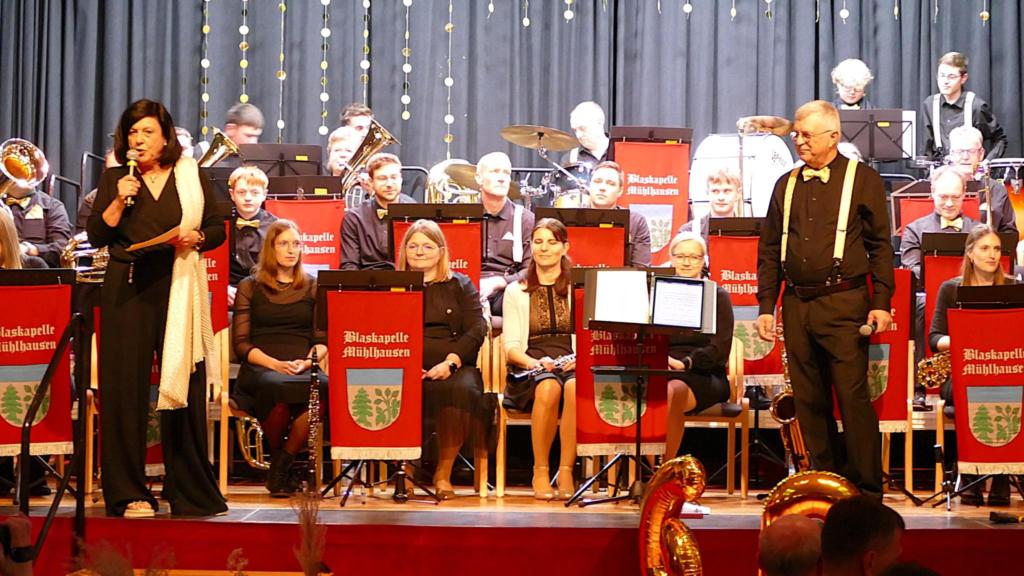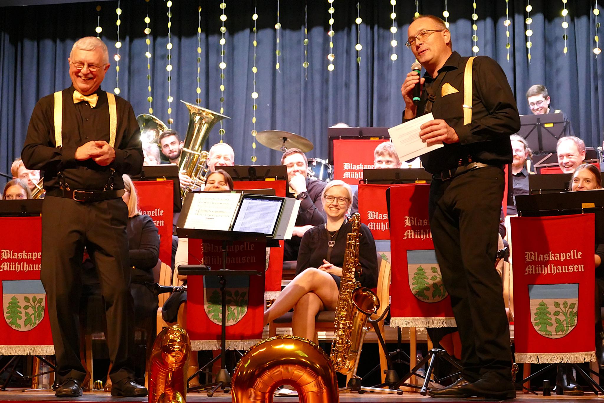 Erster Bürgermeister Thomas Memmel bedankte sich bei der größten Musikkapelle in der Stadt Neustadt für das herausragende Engagement und Einsatz bei sämtlichen Festen und Konzerten während des Jahres. „Darüber hinaus habt ihr es zu eurer Aufgabe gemacht, Stücke aus unserer Region, die sonst in Vergessenheit geraten, lebendig zu halten, auf die Bühne zu bringen.“ Er überraschte „die Kulturbotschafter der Stadt Neustadt“ mit einer Einladung zum Neustadt-Treffen am 20. Juli 2027 nach Nieuwstadt in Holland. Für ihn ist die „Blaskapelle Mühlhausen – The Sound of Heimat“.