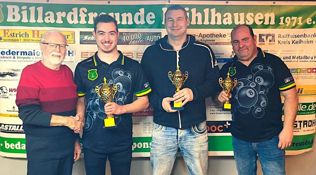 Die Sieger – Robin Scharf, Michael Reinhold, Michael Konrad – der 8-Ball Vereinsmeisterschaft 2026 mit Vorstand Fischer (l) bei der Pokalverleihung.
