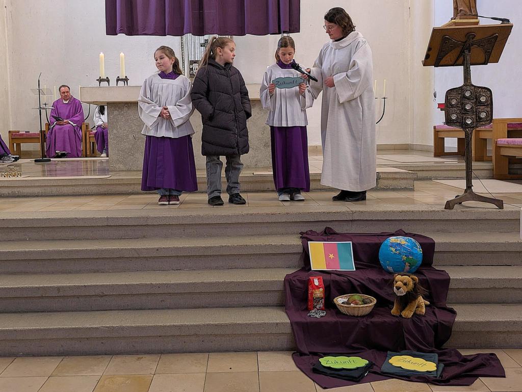 „In den unterschiedlichen Landschaften leben unter anderem Löwen und Flusspferde. Auf den Bäumen wachsen Mangos, Papayas, Avocados und auch Kaffeebohnen“ stellte Gemeindereferentin Maria Ganslmeier mit Unterstützung von Kindern das zentralafrikanische Land während des Gottesdienstes vor. Mit der diesjährigen Misereor-Aktion nach dem Motto „Hier fängt Zukunft an“ werden dort junge Menschen unterstützt, einen Ausbildungsplatz zu bekommen.