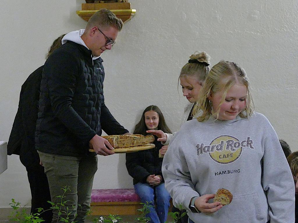 Die beiden Vorstände Jonas Sigl und Anna-Lena Thoma reichten Donauer Maximilian, Ettmüller Theresa, Frühmorgen Lukas, Jutzas Moritz, Loibl Florian, Moser Lena, Möbius Lena, Prücklmeier Luca, Rottenkolber Anna, Wiesmayer Linda, Zott Laura einen Laib Brot, von dem sie sich ein Stück abbrechen durften.