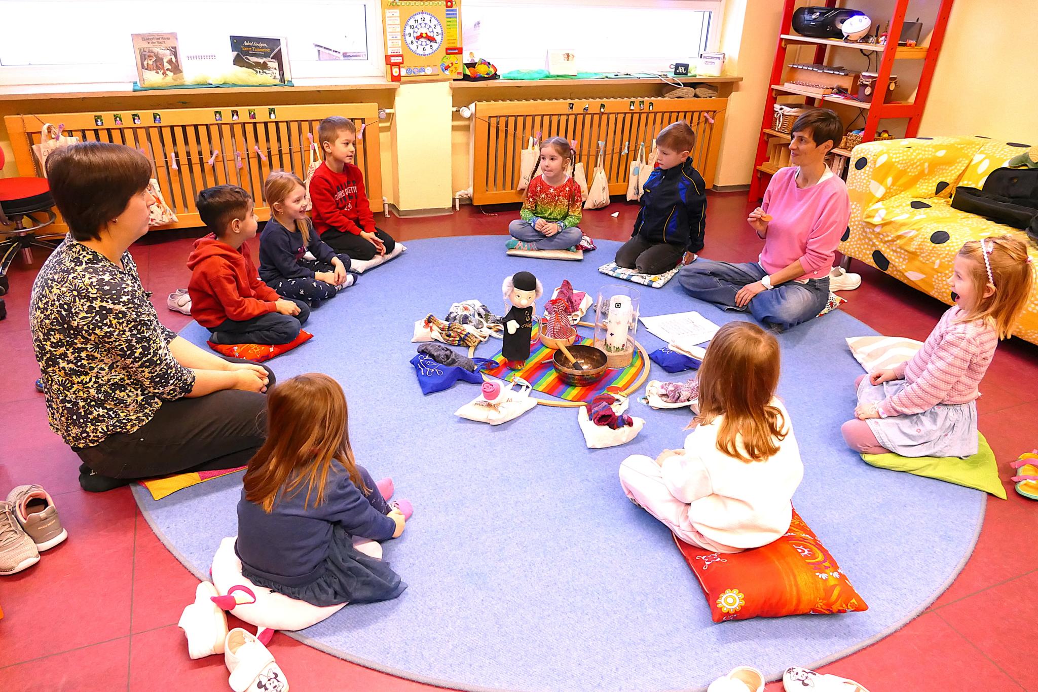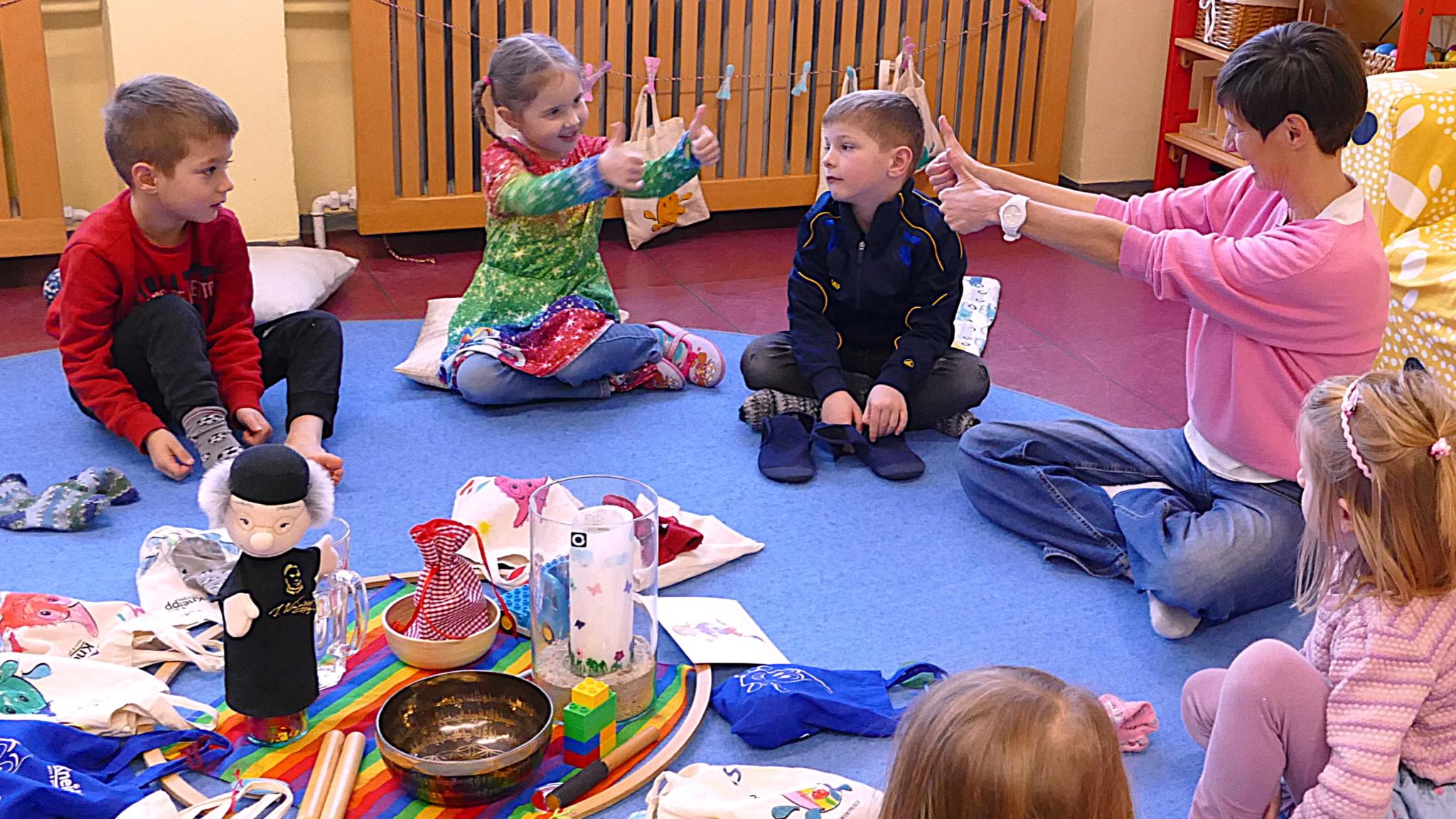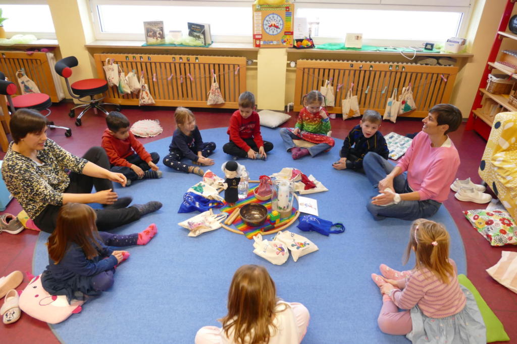 Beim Klang eines Gongschlages auf eine Klangschale durch das Morgenkreiskind Iris wurden die Kinder auf ihren Sitzkissen rund um Pfarrer Kneipp, der als Puppe in der Mitte des Morgenkreises steht, ganz ruhig.