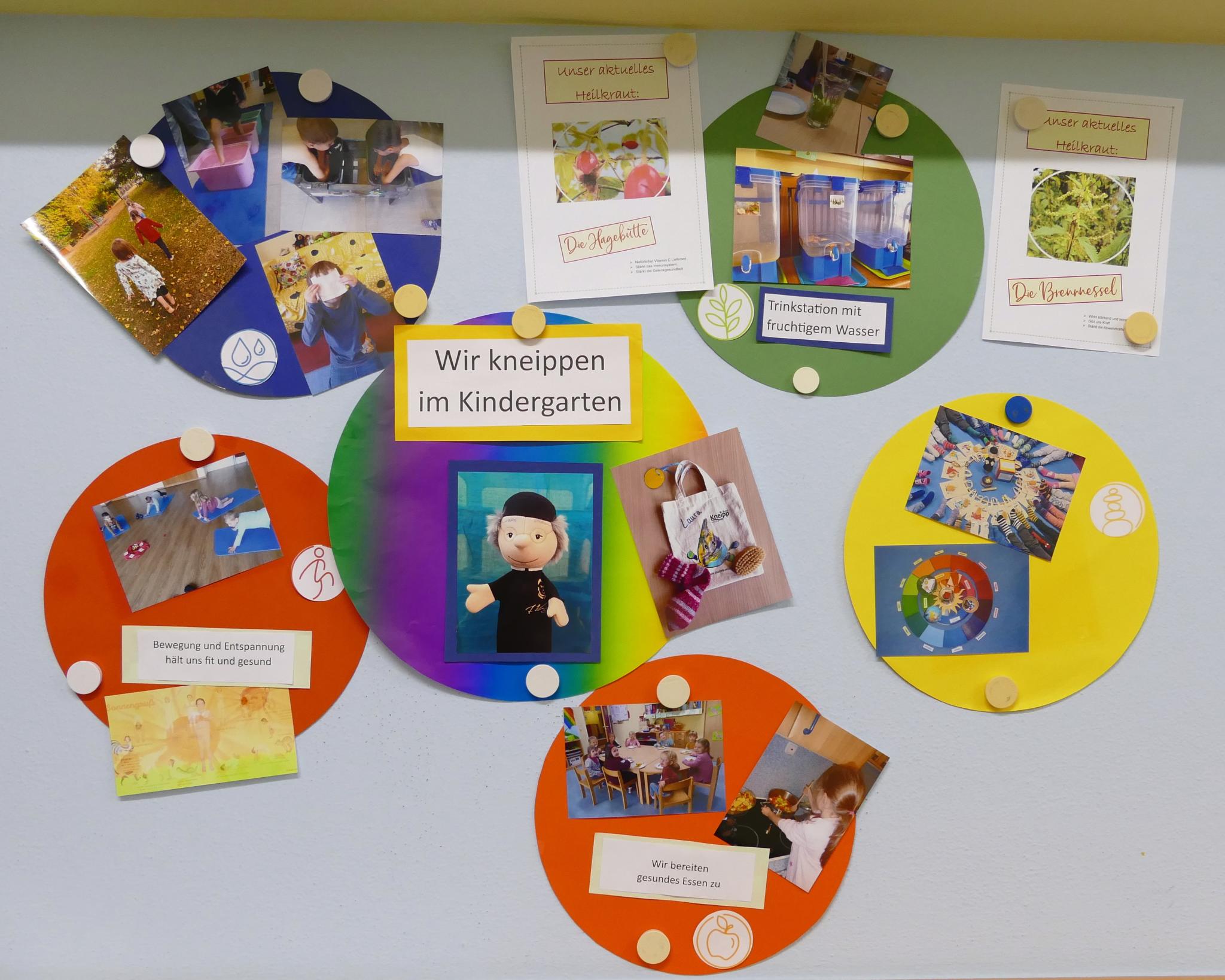 Die Symbole der fünf Elemente „Wasser, Heilpflanzen, Lebensordnung, Bewegung und Ernährung“ nach der Lehre von Pfarrer Sebastian Kneipp sind im Kindergarten überall präsent, vom Gartenzaun bis in die Gruppenräume.