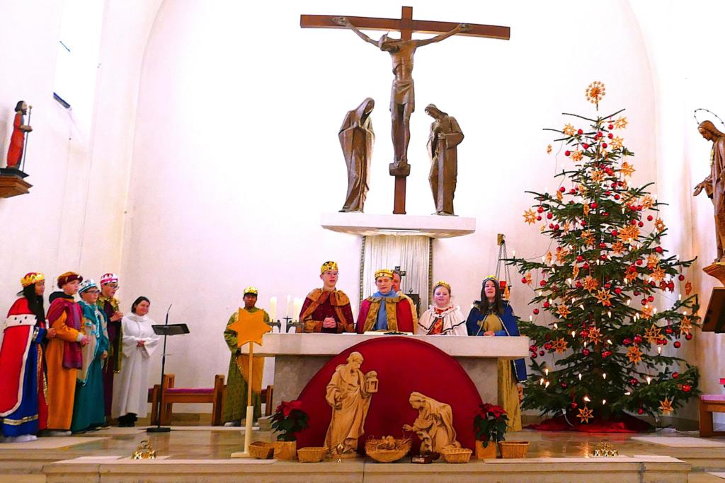 Zusammen mit Gemeindereferentin Maria Ganslmeier brachten die Kinder den Gottesdienstbesuchern die „Drei Könige“ etwas näher. „Eigentlich bin ich schon viel zu alt für eine Reise“ stellte Melchior, der älteste der Sterndeuter fest, „aber der Stern verspricht mir Friede und Gerechtigkeit“. Er gab dem Jesuskind einen Teil seines Reichtums, nämlich Gold. Balthasar sah sich „als Mann im besten Alter“ und brachte als Zeichen der Gegenwart Gottes den Weihrauch mit. Der jüngste im Bunde, Kaspar legte ein besonderes Heilkraut, Myrrhe an der Krippe nieder.