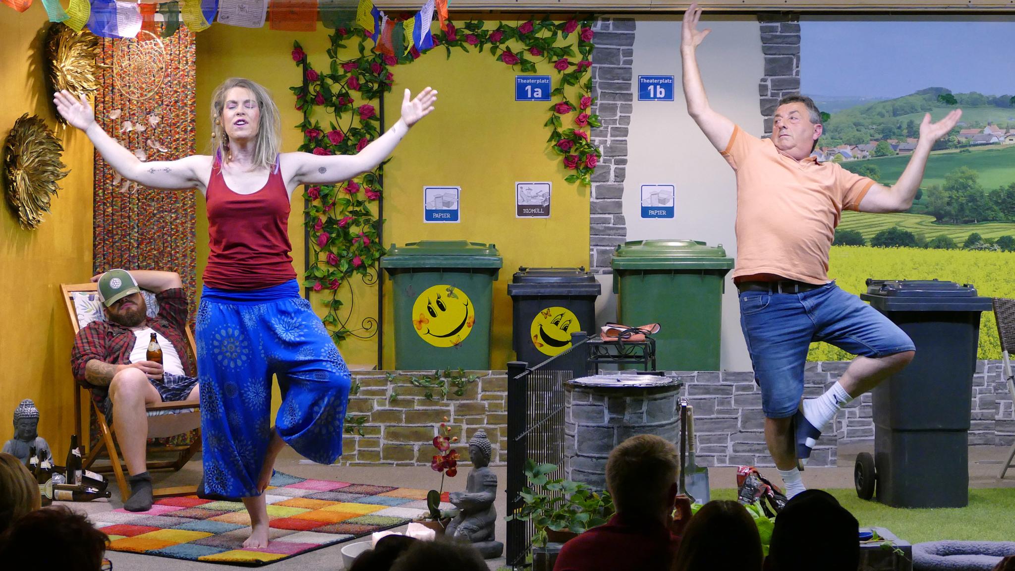 Kurz vor dem zweiten Stück untersuchten zwei Bauarbeiter, die beiden Regisseure Anita Jutzas und Tobias Eichhammer, den Zustand des Hauses der Vereine und berichteten von Vermessungsarbeiten. Da wurde der anwesende Bürgermeister Thomas Memmel hellhörig. Plant er doch mit dem Stadtrat schon seit einigen Jahren das langjährige Domizil des Theatervereins abreißen zu lassen, um einen neuen Kindergarten zu bauen. „Vermutlich werden wir aber auch in den nächsten Jahren hier noch Theater spielen“ beruhigten Jutzas und Eichhammer die Gäste.