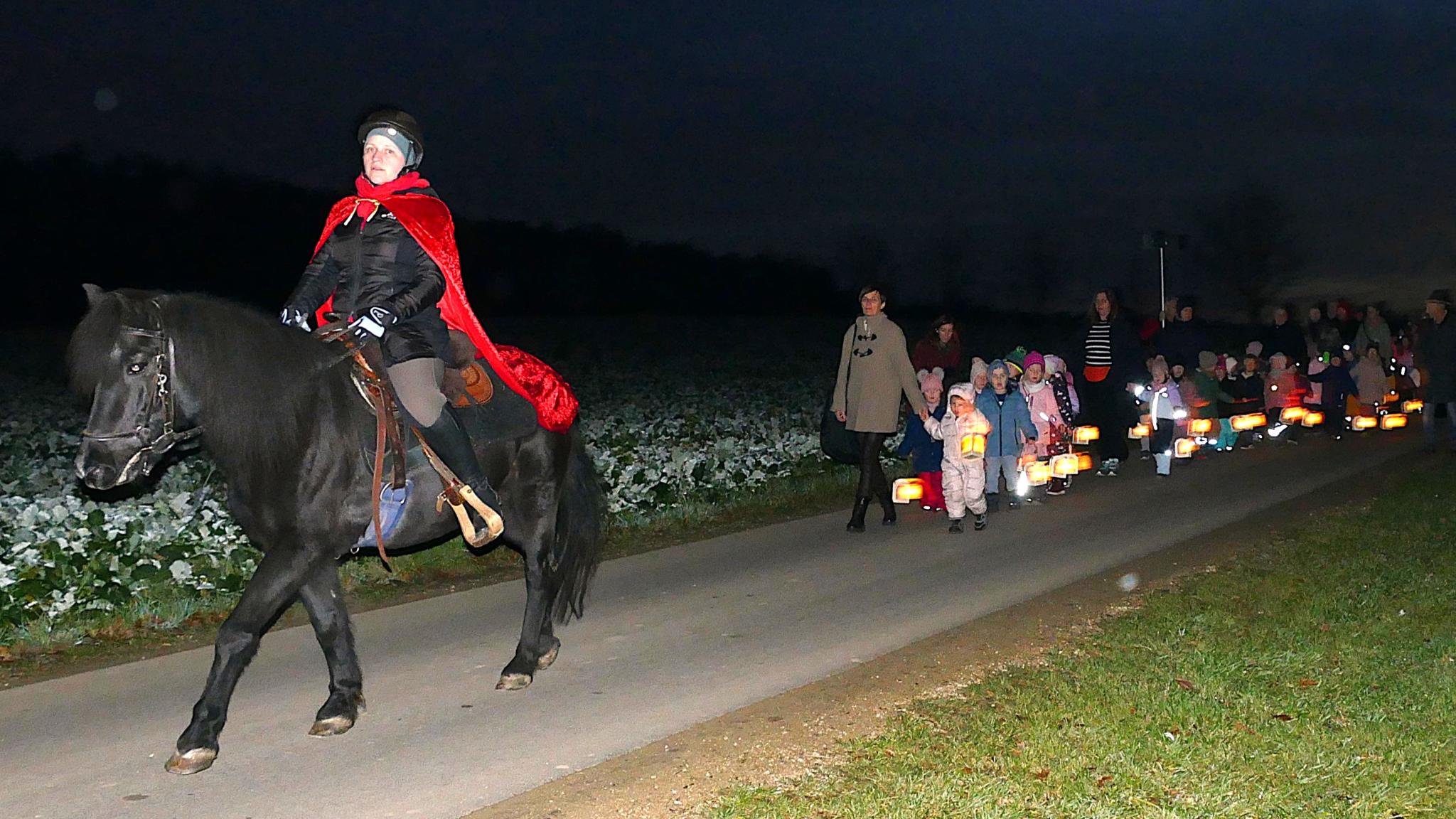 Auf der Straße wartete ein „echter“ St. Martin auf einem Pferd. Pia Widmann ritt als St. Martin mit einem großen, roten Umhang voraus bis zum Eingang des Kindergartens. Während des Umzugs stimmten Gabi Reinhard und Martha Kastl mit ihrer Vitus-Sängerbande die Lieder „Ich geh mit meiner Laterne“, „Durch die Straßen auf und nieder“ und „Laterne, Laterne, Sonne, Mond und Sterne“ an.