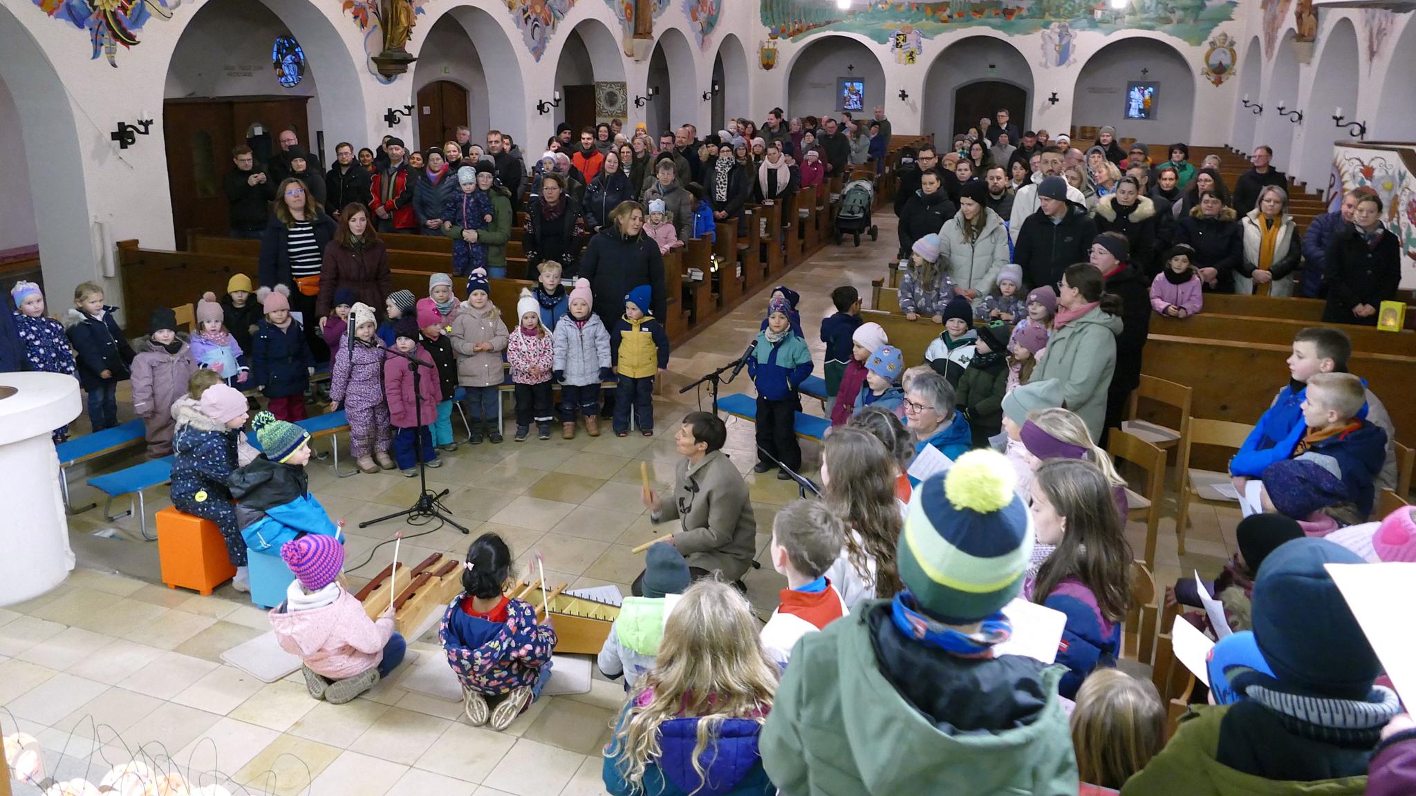 Mit dem Lied „Herein, herein, wir laden alle ein“ begrüßten die Kinder des Kindergartens St. Franziskus neben ihren Geschwistern, Eltern und Großeltern auch Bürgermeister Thomas Memmel und einige Stadträte in der Pfarrkirche St. Vitus.
