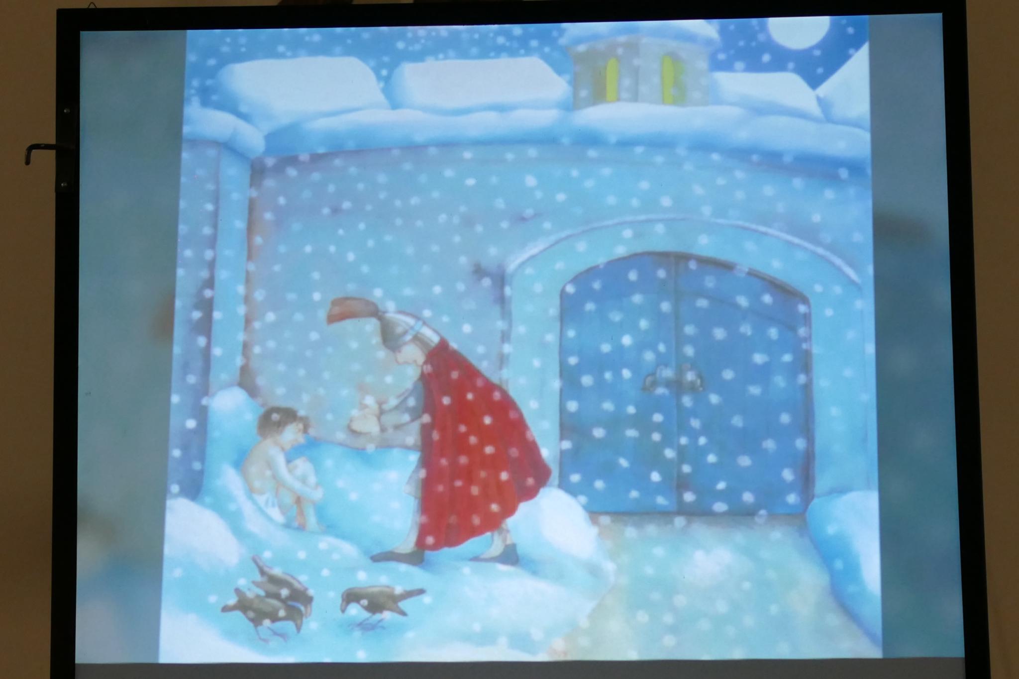 Monika Sedlmayer erzählte mit Bildern, auf eine Leinwand projiziert, die Geschichte vom Soldaten Martin, wie er seinen Mantel mit einem Bettler teilte und schließlich zum Bischof gewählt wurde. Zwischen den einzelnen Szenen begleitete die Vitus-Sängerbande die Geschichte gesanglich mit dem Martinslied.