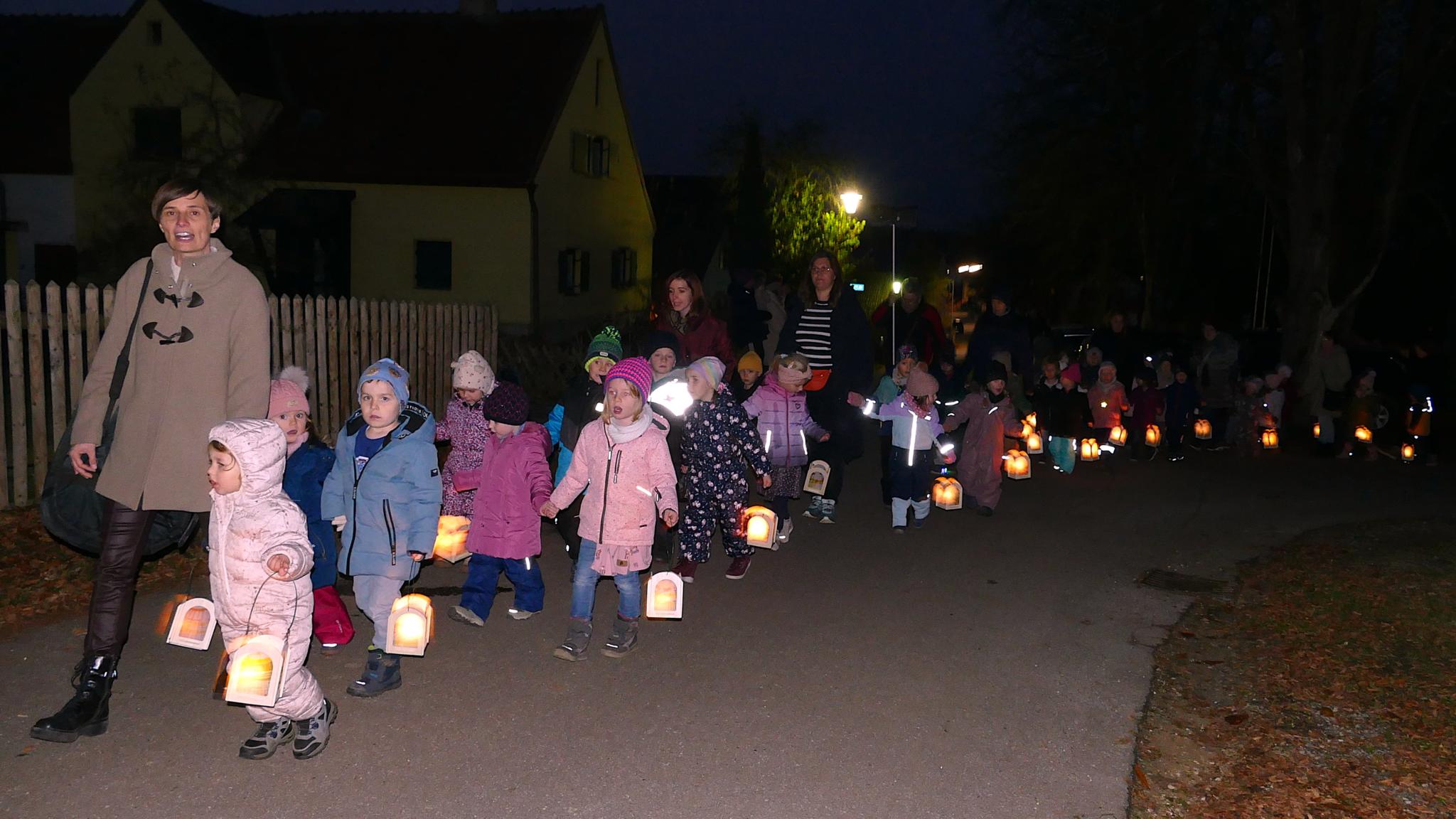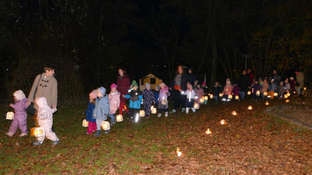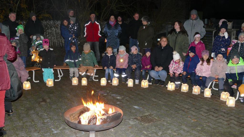 Der beleuchtete Weg führte die Kinder zum Vorplatz des Kindergartengebäudes, wo sie im Kreis sitzend „Ein bisschen so wie Martin möchte ich manchmal sein“ sangen.